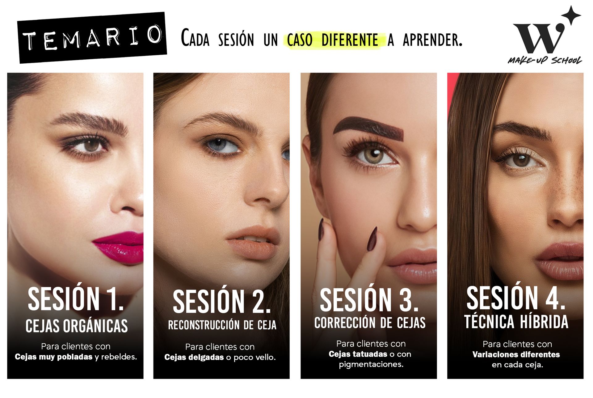 Aprenderás 4 técnicas para maquillar las cejas más temidas entre maquillistas: ceja extremadamente poblada, ceja poco poblada o sin vello, ceja tatuada y técnica hibrida.